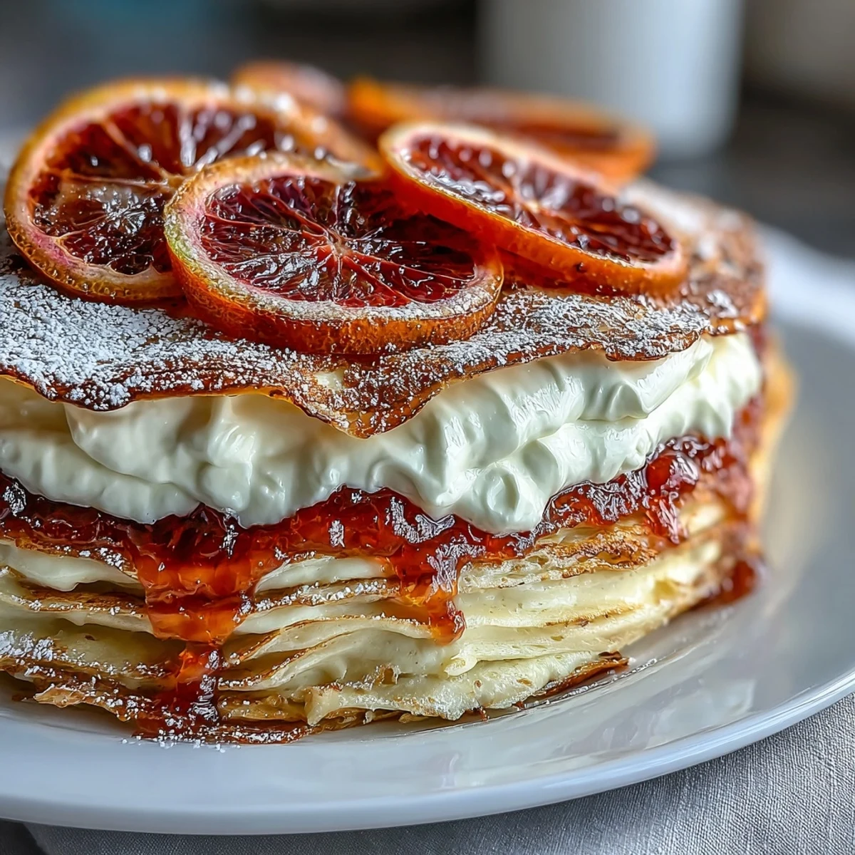 Save to Pinterest My neighbor brought me a bag of blood oranges from her tree, and I stood at the counter slicing one open, mesmerized by that deep ruby color bleeding across the cutting board. I wanted something that would show them off without burying their brightness under chocolate or spice. That afternoon, I built this crêpe cake layer by layer, each one a thin whisper of citrus and cream. When I sliced into it that evening, the stripes looked like sunset captured between pancakes.
