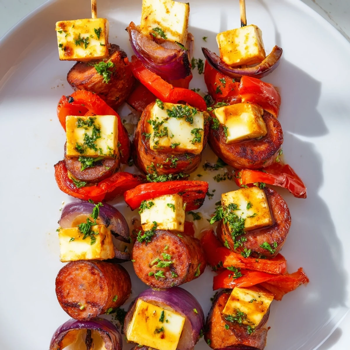 Sausage sliced into rounds, cheese into cubes, bell pepper and onion cut into chunks. Marinate with olive oil and spices before threading onto skewers.