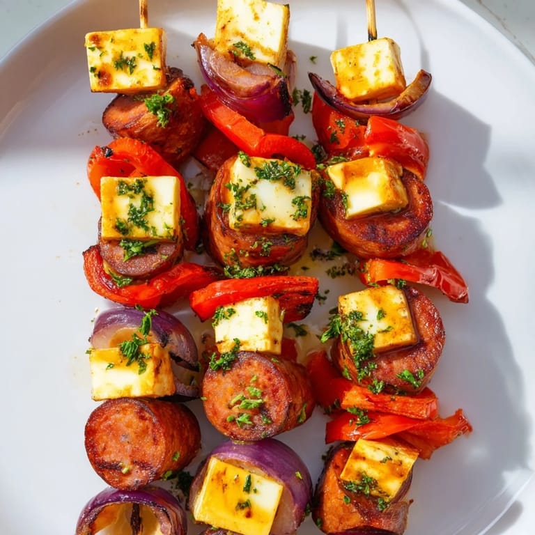 Save to Pinterest A hearty and flavorful appetizer featuring smoky sausage rounds and melty cheese cubes stacked and grilled on skewers, perfect for sharing at gatherings.