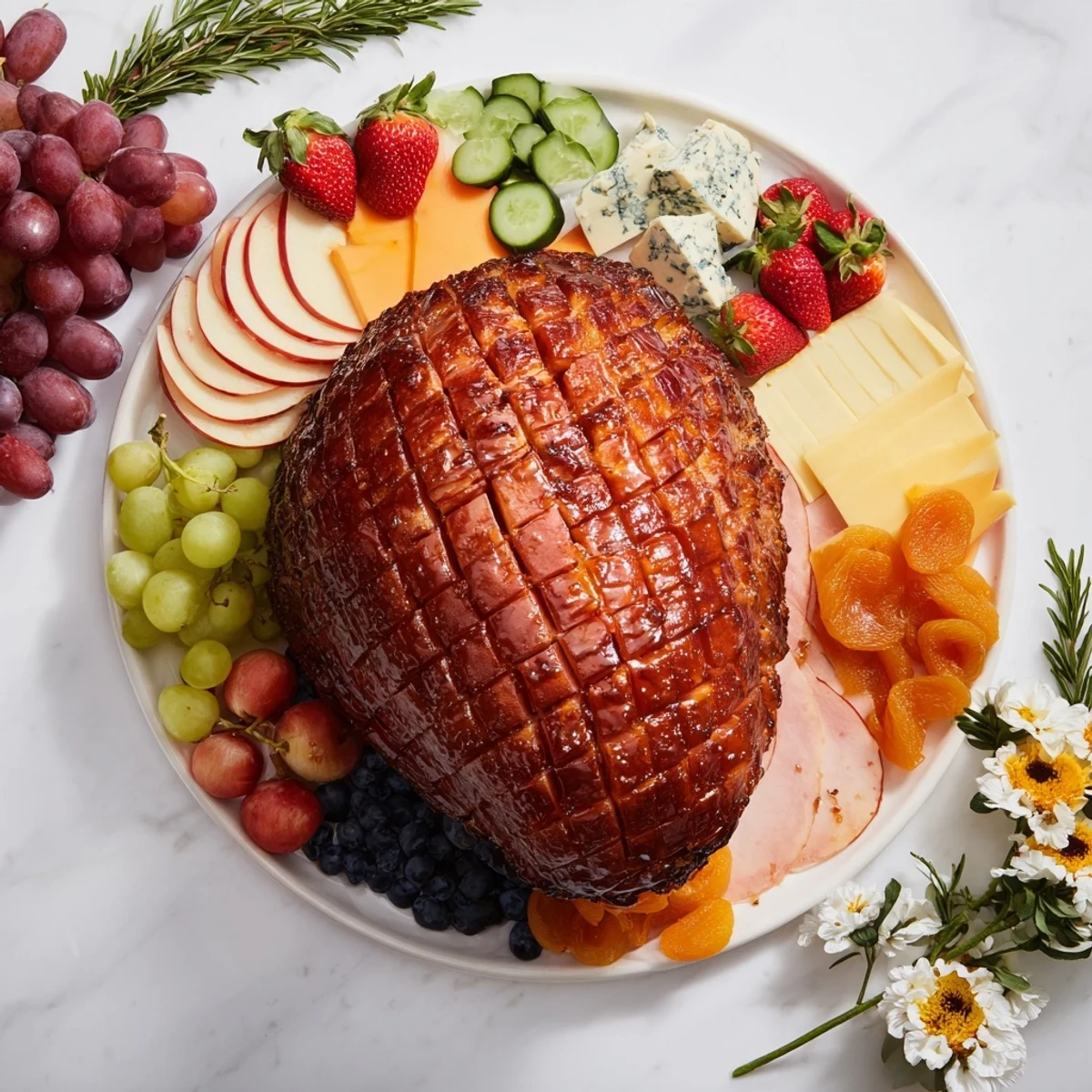 - Place your ham or ham roses at the center of your large board. Then, working outward like you're creating a mandala, arrange your cheeses in small sections—aged cheddar here, brie there, blue cheese in its own corner. Group fruits together so the colors play off each other: grapes here, strawberries there. Let negative space breathe on the board; it looks more intentional than crowding everything together. Fill in with breads, crackers, vegetables, and condiments in the gaps. This is where you slow down and let the board tell you what it wants.